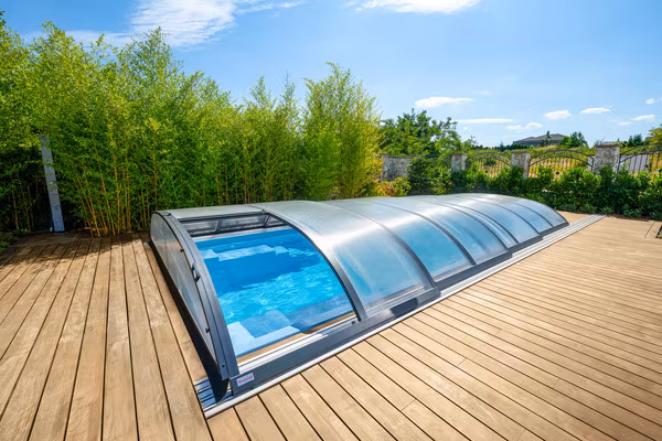 För att skydda din investering medföljer det stilrena Compact-pooltaket – ett lågprofilt, skjutbart tak som skyddar mot smuts, regn och värmeförlust, samtidigt som det bevarar utsikten och smidigt kan öppnas för bad.