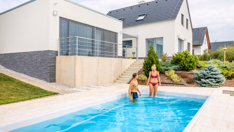 •Glasfiberpoolen med integrerade trappor.