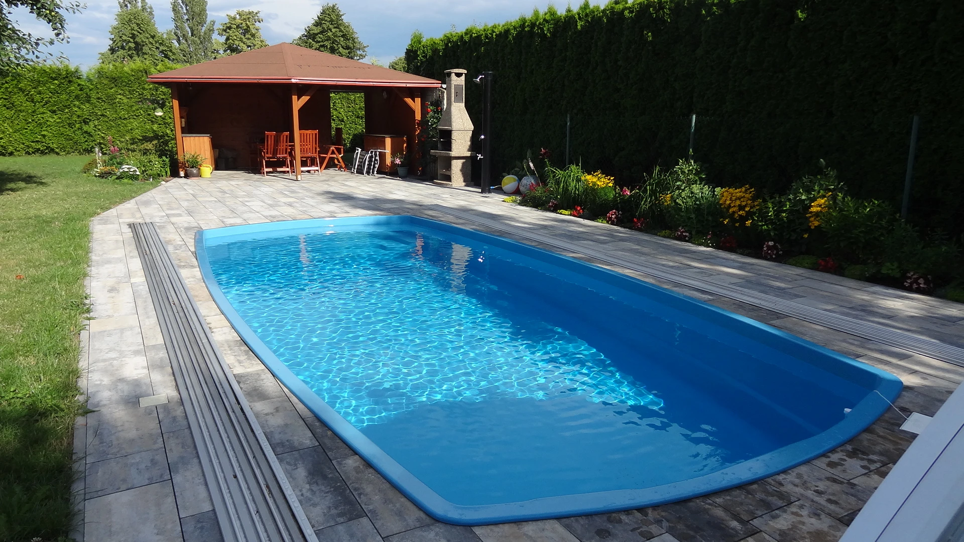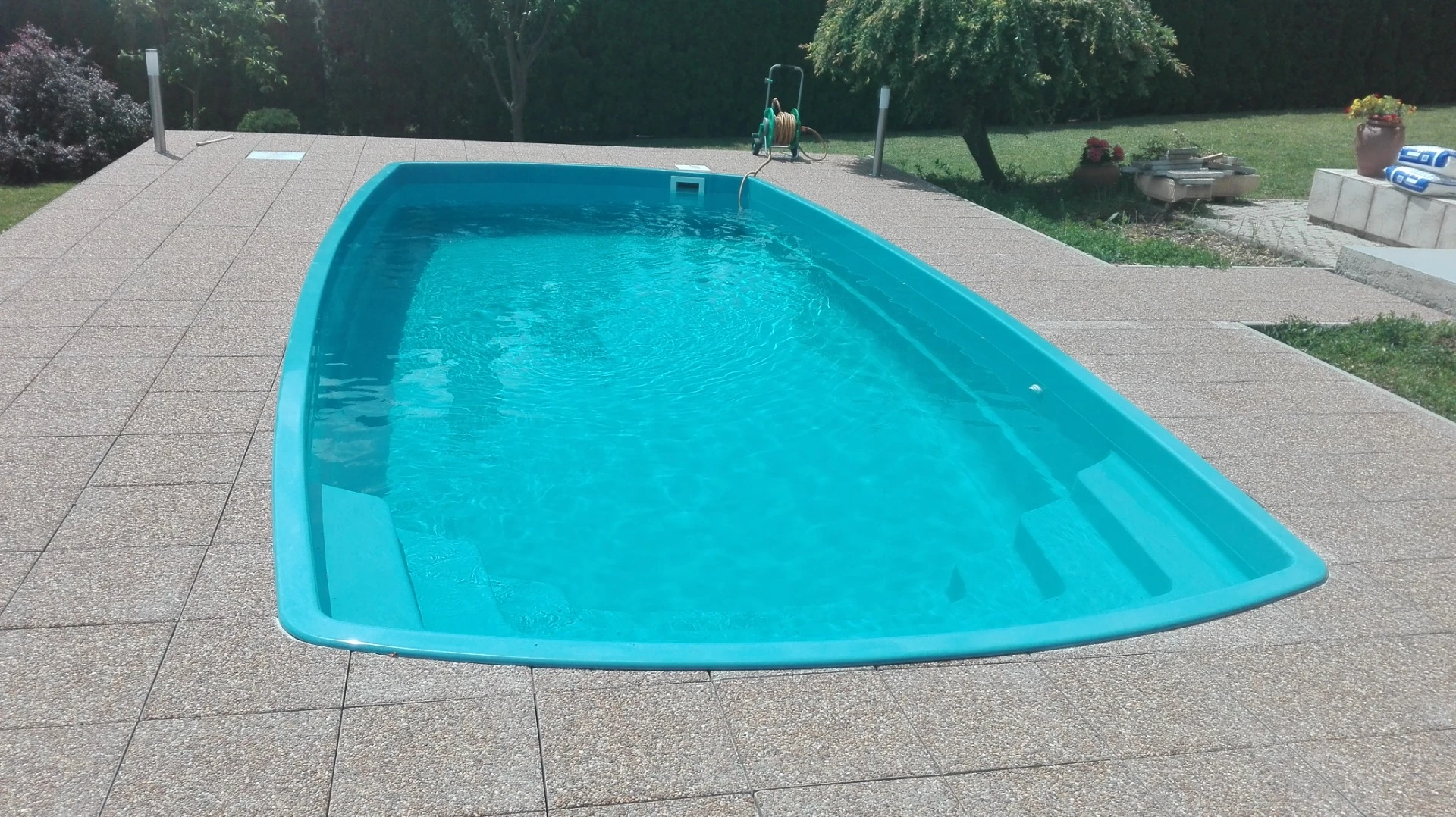 •Glasfiberpoolen med integrerade trappor.