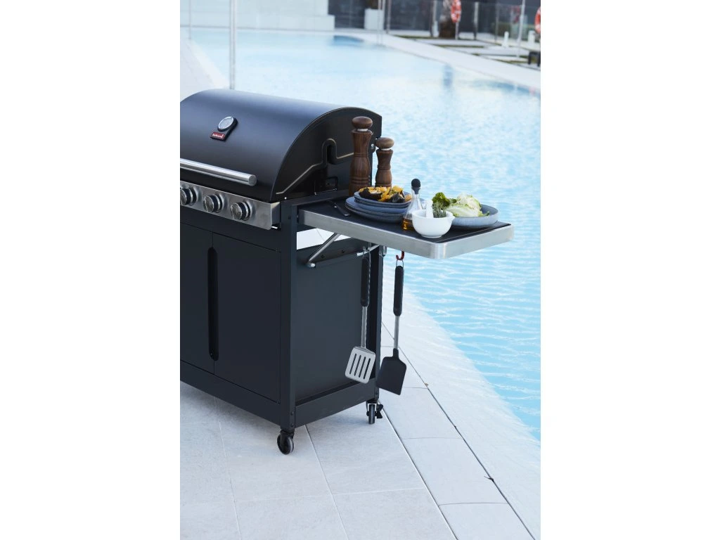 Barbecook Stella 4311 är en elegant och välutrustad gasbarbecue som kombinerar hög grillkapacitet med smart funktionalitet och exklusiv design. Den svarta finishen ger ett modernt uttryck som passar perfekt i utemiljön, samtidigt som grillens prestanda levererar gastronomiska resultat – från perfekt grillade biffar till saftiga grönsaker och läckra tillbehör.