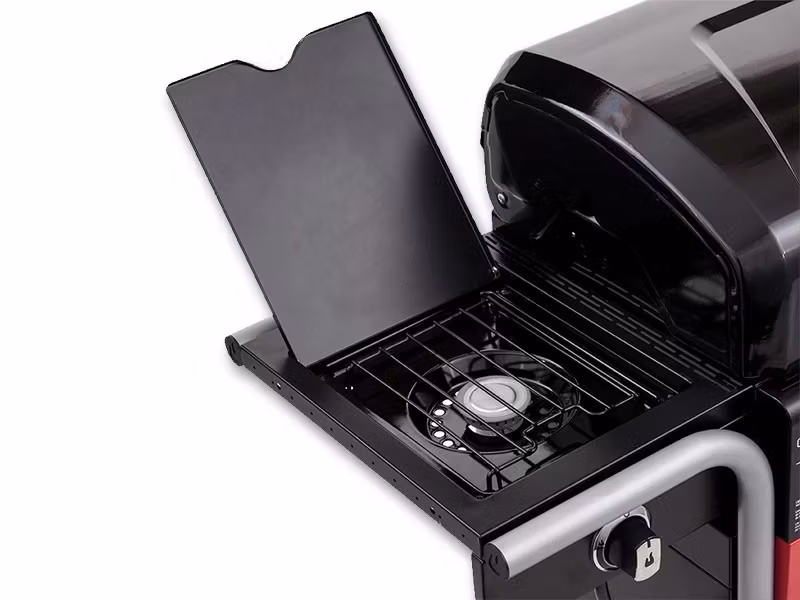 Förvaringsmöjligheter – plats för gasflaska under grillen, sidobord och funktionella detaljer som inbyggd kapsylöppnare.