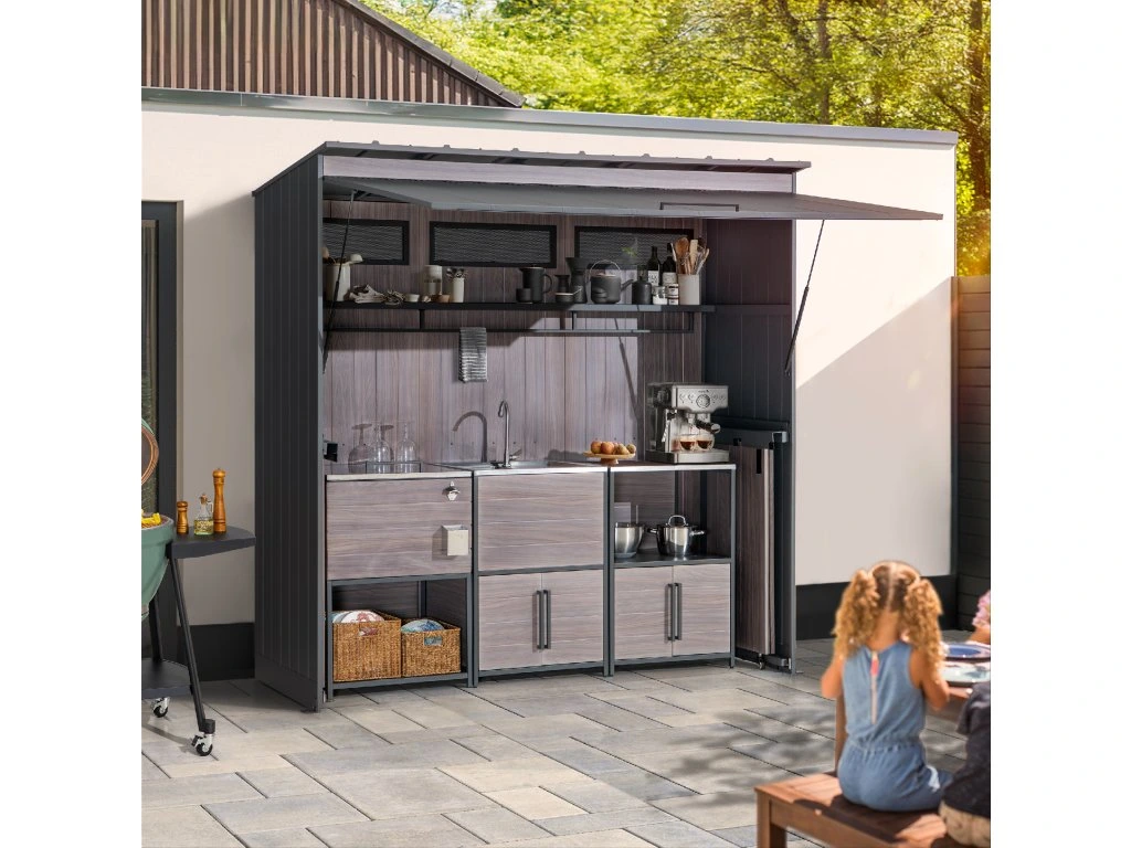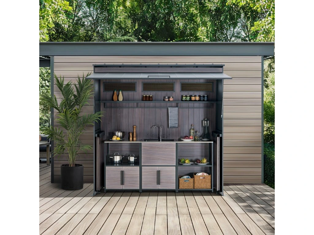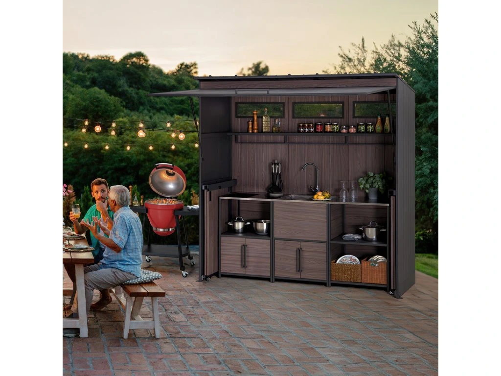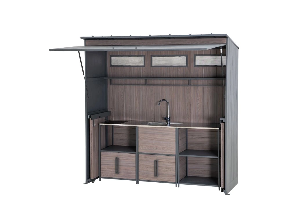 Fleetwood Kitchen Set är ett fristående, modulärt utekök som kombinerar modern design med praktisk funktionalitet. Med integrerad diskho, barcenter och generös förvaring skapar det en komplett arbetsstation för matlagning utomhus – perfekt för både vardagsgrillning och större sociala tillställningar.