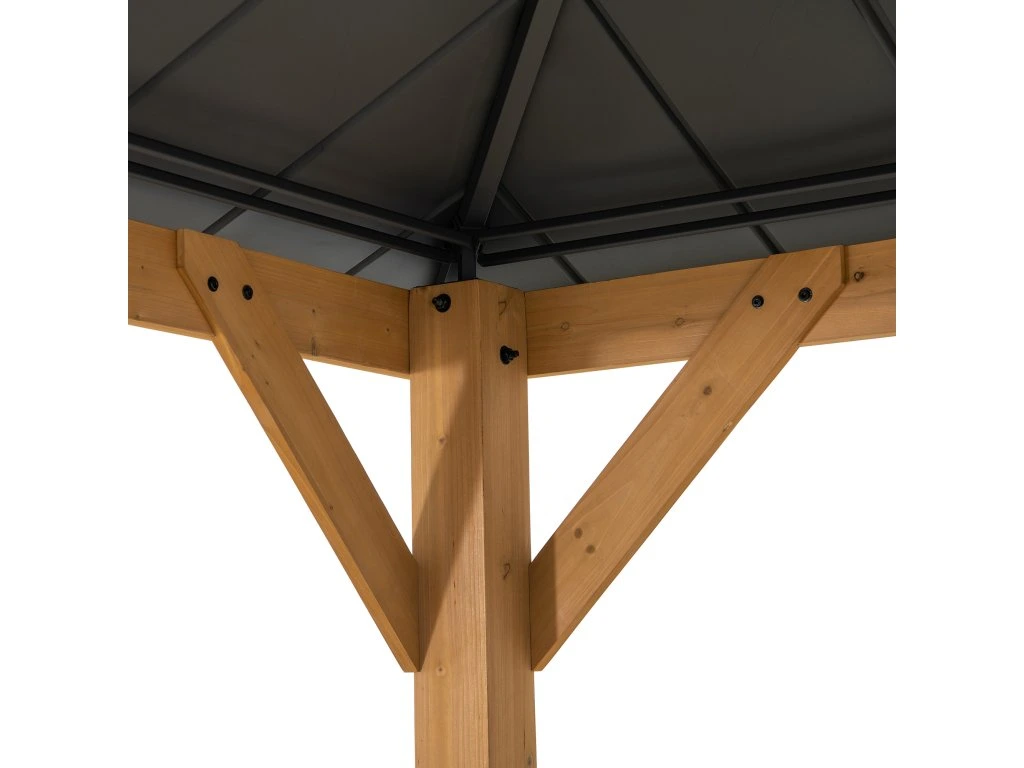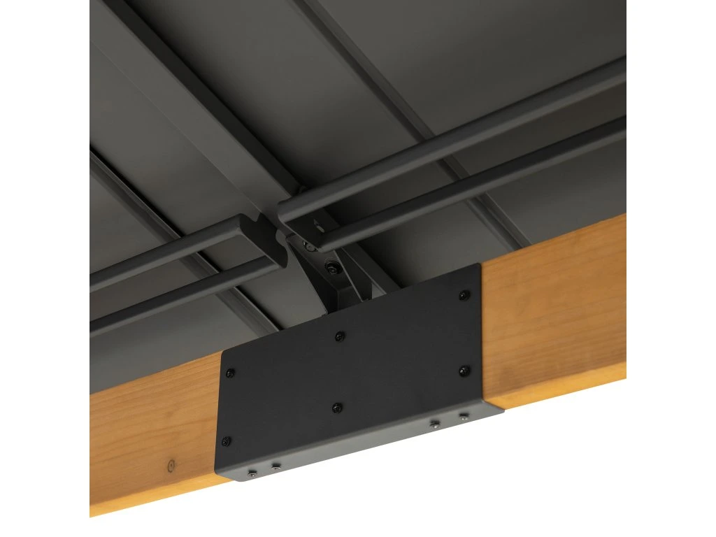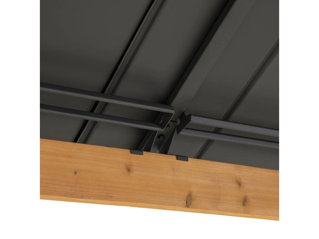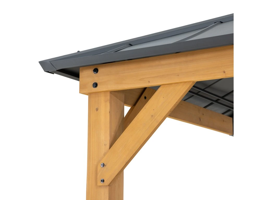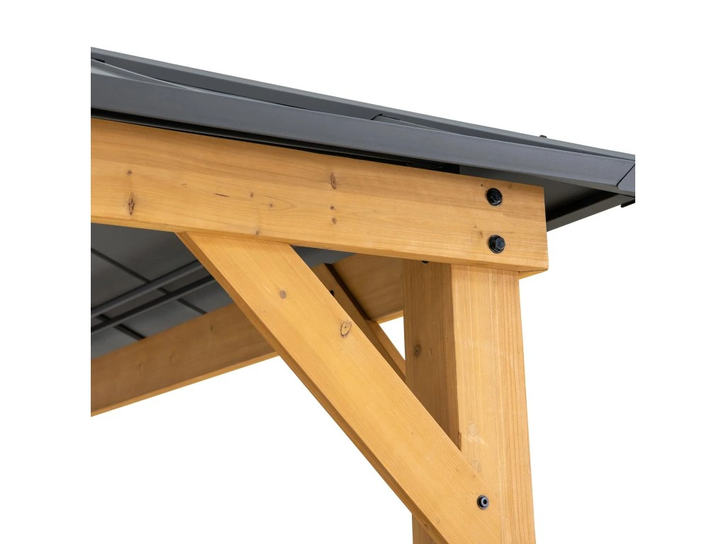 Trivor 390 x 450 cm Hard Top Gazebo är en exklusiv och rymlig paviljong som kombinerar modern design med hållbar konstruktion. Med sitt dubbla tak, kraftiga stålram i antracit och FSC® 100%-certifierade trädetaljer skapar den en skyddad och elegant samlingsplats i trädgården.