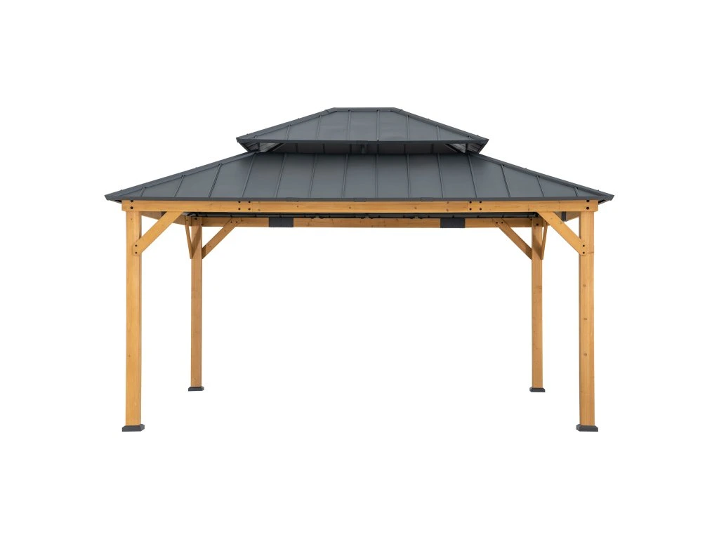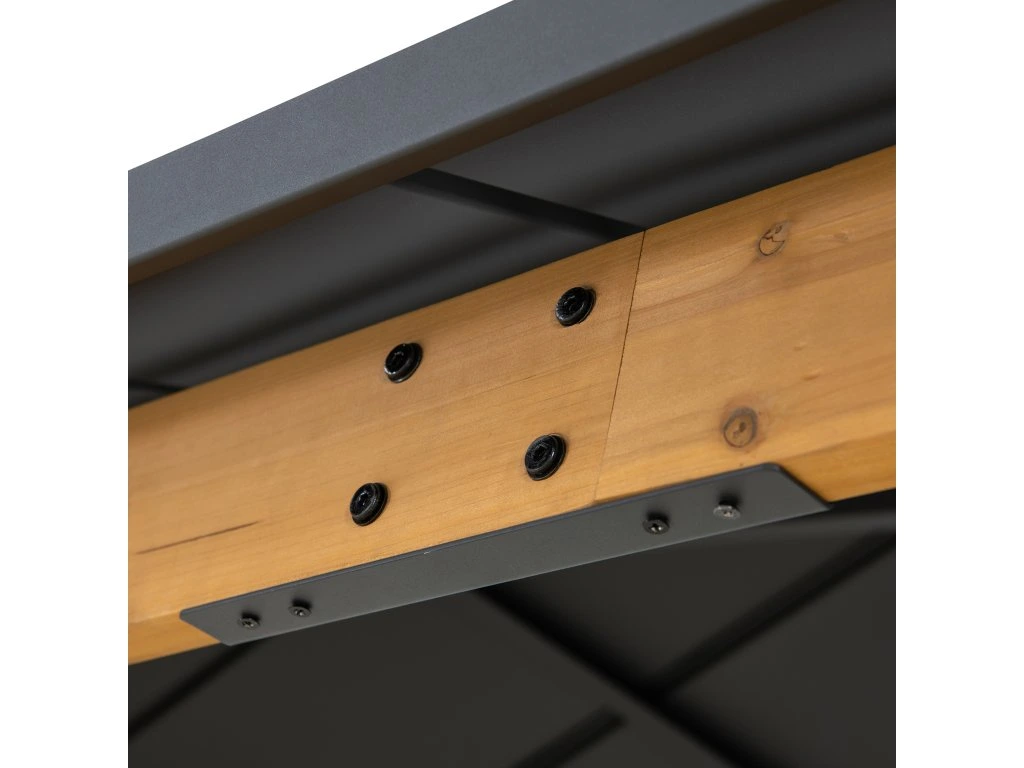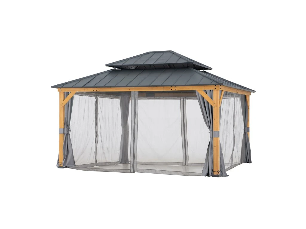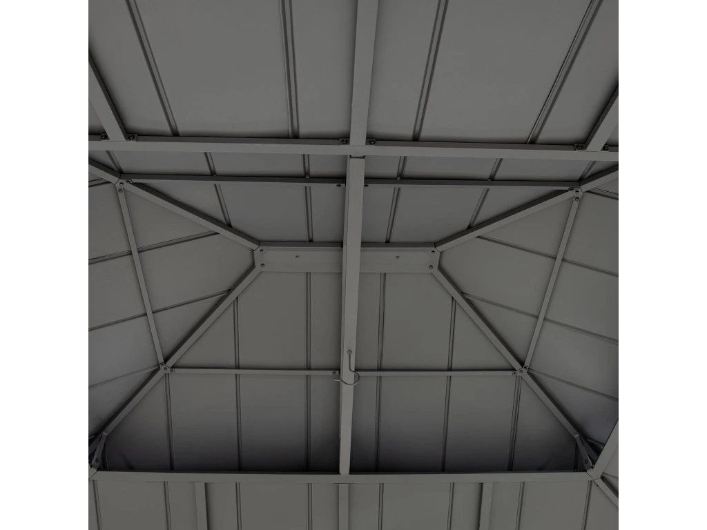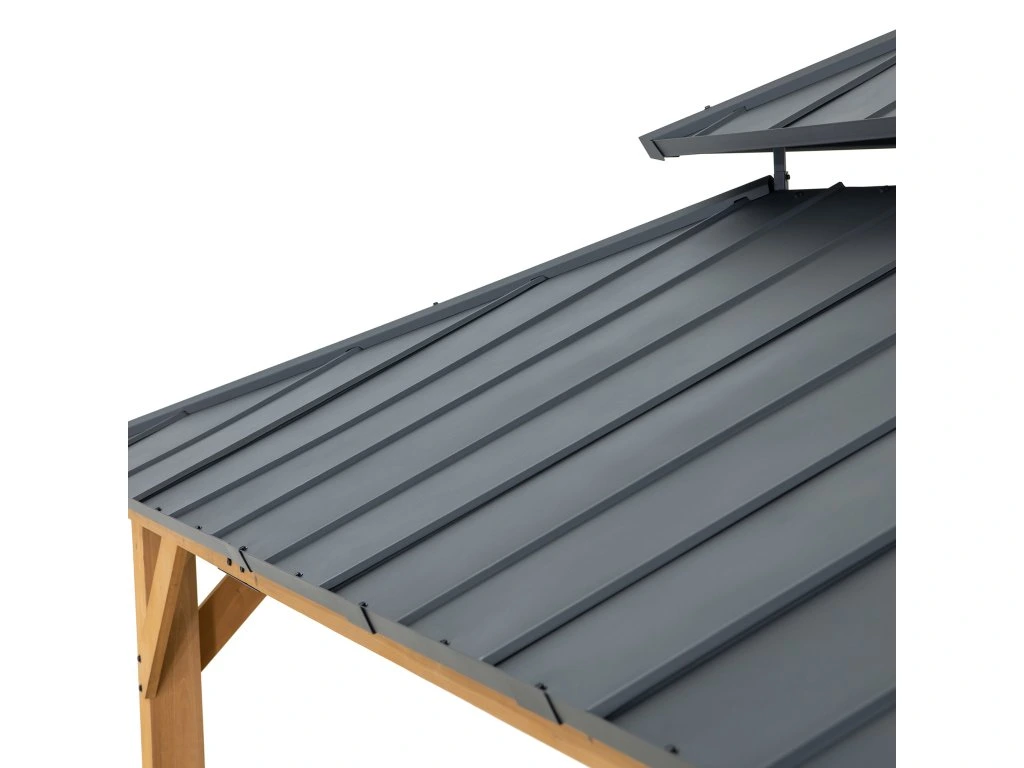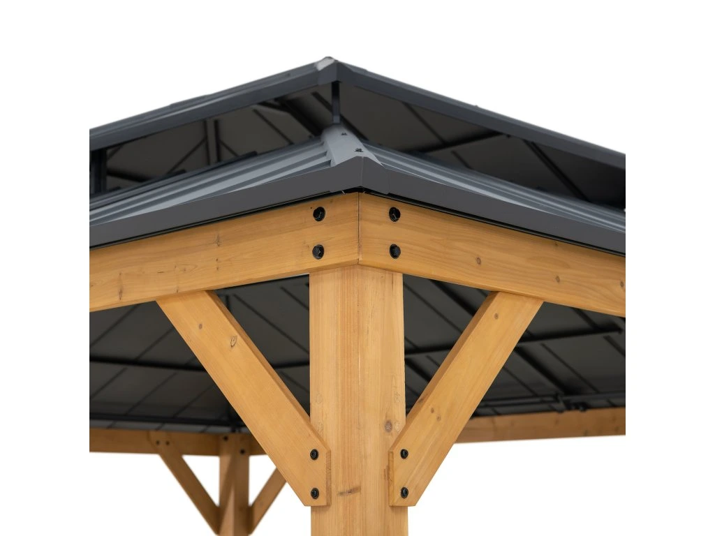 Trivor 390 x 450 cm Hard Top Gazebo är en exklusiv och rymlig paviljong som kombinerar modern design med hållbar konstruktion. Med sitt dubbla tak, kraftiga stålram i antracit och FSC® 100%-certifierade trädetaljer skapar den en skyddad och elegant samlingsplats i trädgården.