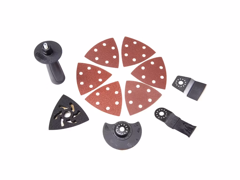 Tillbehör: slipplatta, slipark, sågblad och skrapa